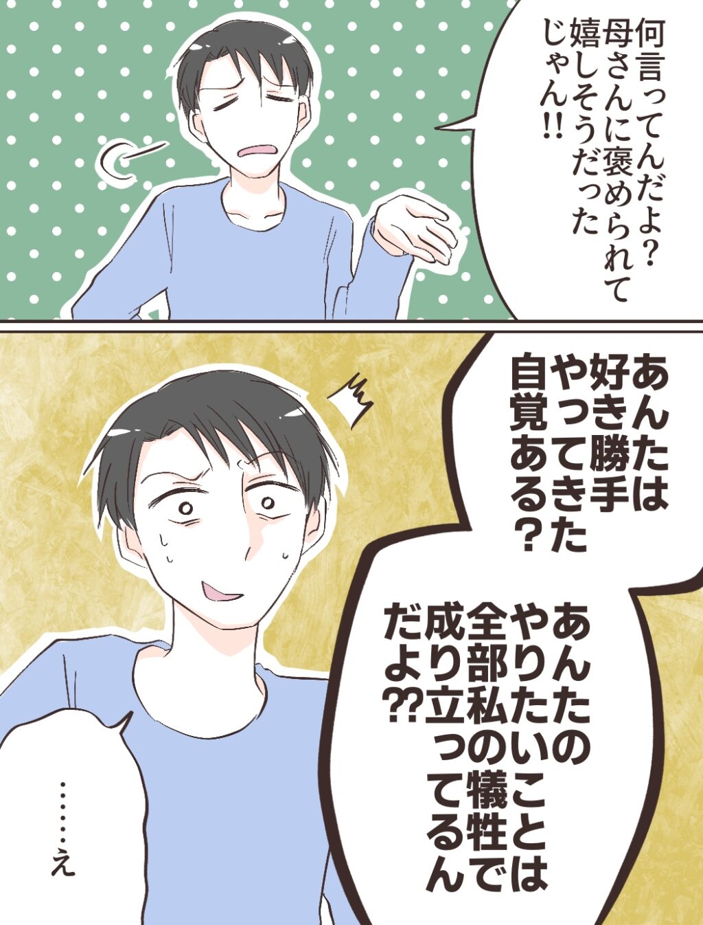 するとカズキが「何言ってんだよ?母さんに褒められてて嬉しそうだったじゃん」と呆れた様子で話してきます。私が一生懸命支えてきた結果がこれです。信じられません。私は「あんたは好き勝手やってきた自覚ある?あんたのやりたいことは全部私の犠牲で成り立ってるんだよ?」とハッキリ言ってやりました。