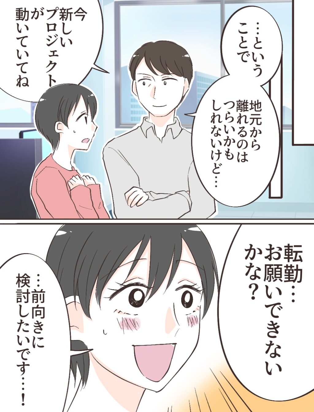 「・・・ということで、地元から離れるのはつらいかもしれないけど、今新しいプロジェクトが動いていてね、転勤お願いできないかな?」上司からの呼び出しは、思いがけない転勤の打診でした。転勤すれば、あの家族から離れられるかもしれない。私は目を輝かせて「前向きに検討したいです!」と答えました。