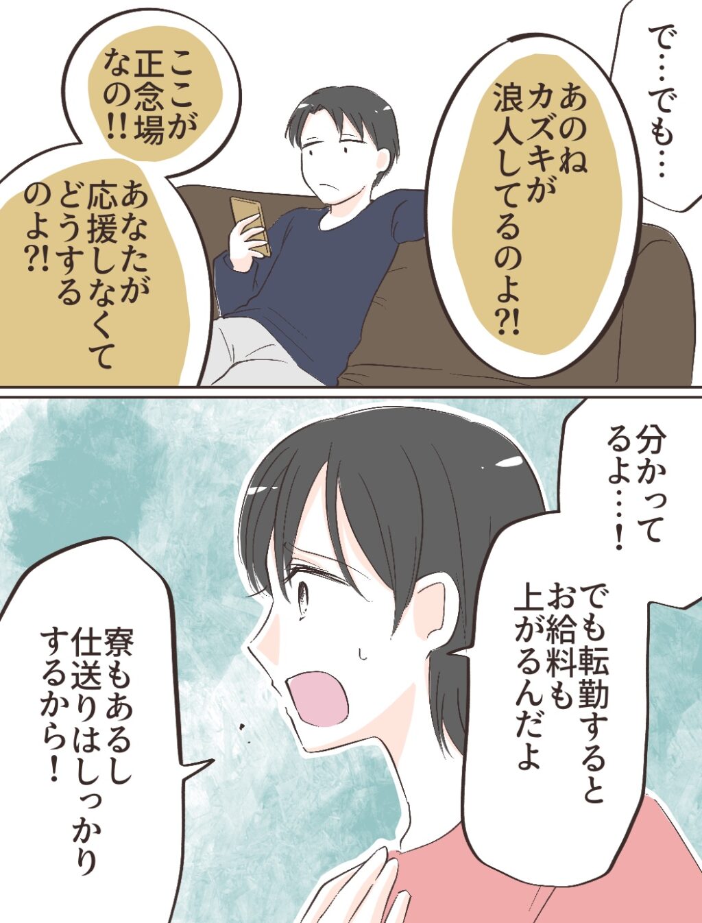 母が転勤を嫌がる理由は、やっぱりカズキでした。カズキは東京の大学を目指したものの現役合格は叶わず、浪人の道を選びました。予備校の費用はもちろん私の給料頼み。だからこそ、今このタイミングで私に出て行かれると困るのでしょう。それでも、自由を手に入れる一歩手前まで来て簡単には引き下がれません。「分かってるよ!でも転勤するとお給料も上がるんだよ、寮もあるし仕送りはしっかりするから!」私は必死に母を説得しました。