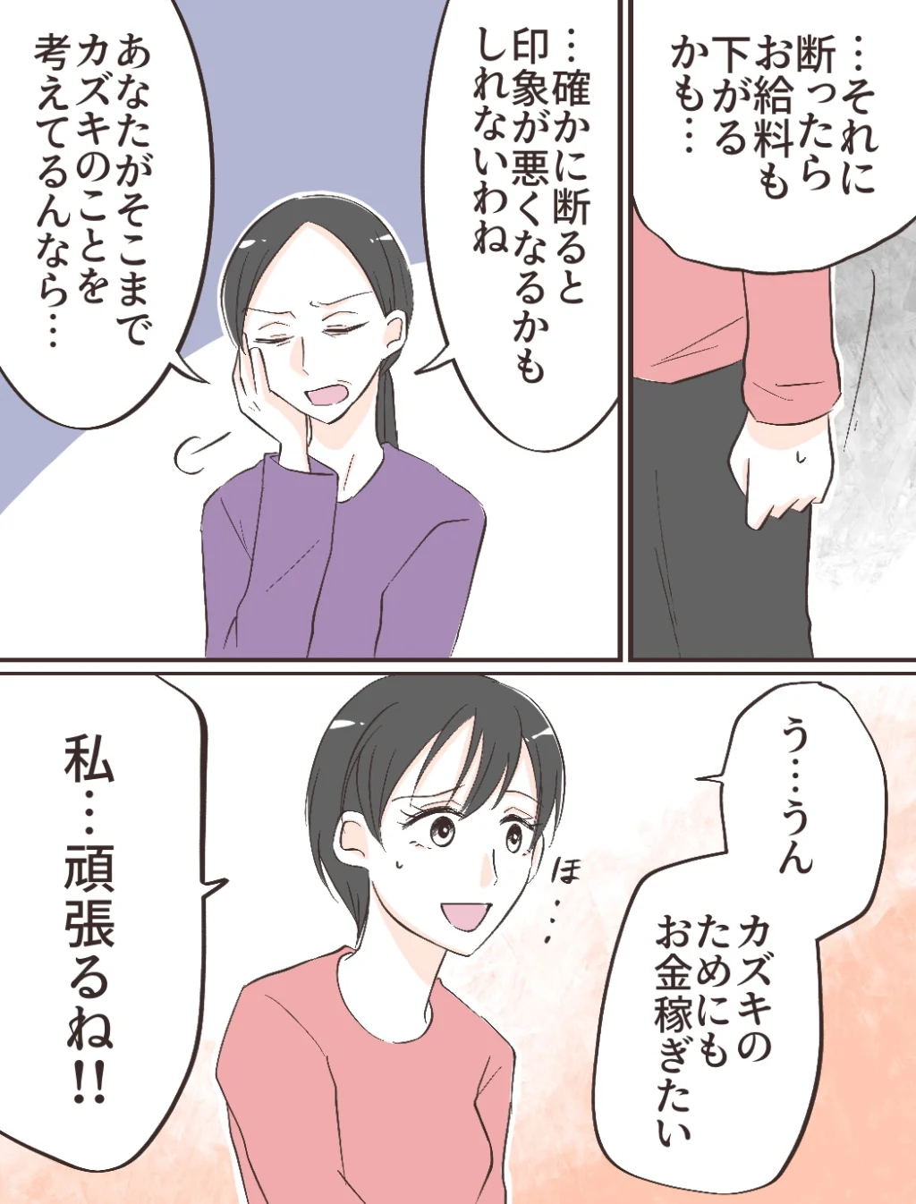 「・・・それに、断ったらお給料も下がるかも」その一言が効いたのか、母は少し考え込み「確かに断ると印象が悪くなるかもしれないわね、あなたがそこまでカズキのことを考えてるんなら・・・」と渋々ながら転勤を認めてくれました。よかった、これで母とカズキから距離を置ける・・・胸の奥でそっと安堵します。私は母の機嫌を損ねないように、「うん、カズキのためにもお金稼ぎたい、私頑張るね!」と心にもない言葉を口にしたのでした。