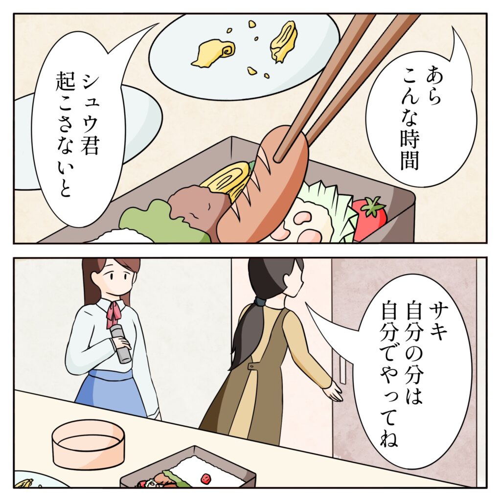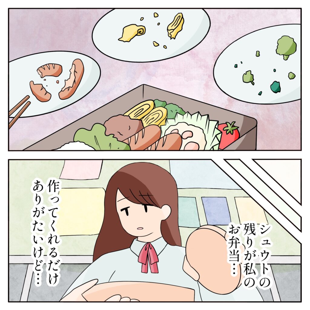 キレイに詰められたシュウトの大きなお弁当は、毎日母がちゃんと準備します。そしてシュウトの残りが私のお弁当です。作ってもらえるだけありがたいけど、毎朝崩れた野菜や卵焼きの端っこを自分で詰めていると、なんだか寂しい気持ちになります。