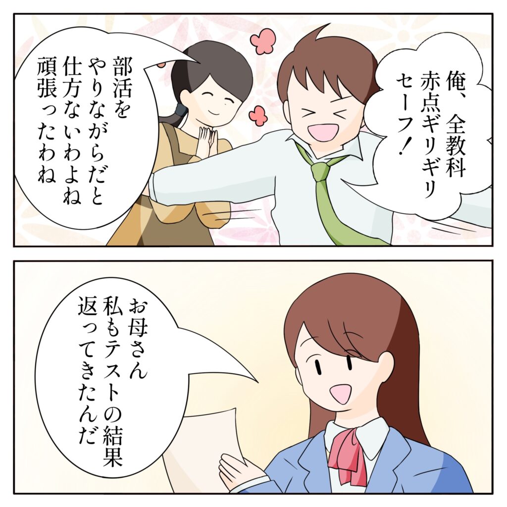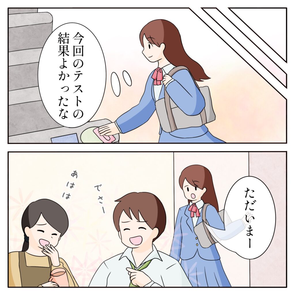 高校でサッカー部に所属しているシュウトは私とは正反対の元気でノリが良いタイプです。正直、勉強ができるとは言えませんが、運動は頑張っているようです。この日はシュウトもテストの結果が出たようで、母に「オレ、全教科赤点ギリギリセーフ!」とおどけてみせていました。「部活をやりながらだと仕方ないわよね、頑張ったわね。」と母はとにかくシュウトが可愛くて仕方がない様子です。ちょうどテスト結果の話をしていたので、「お母さん、私もテストの結果帰ってきたんだ」と、良いタイミングで報告できたと思ったのに。