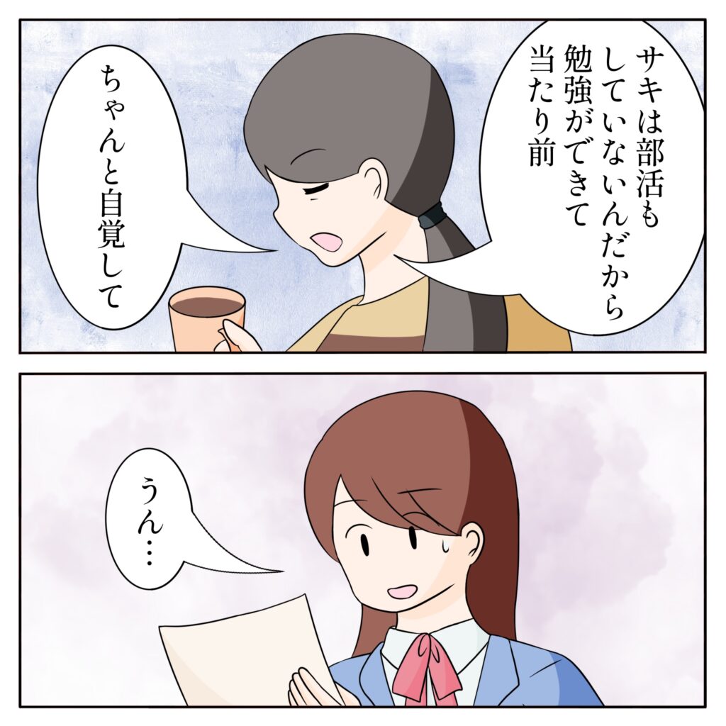 「サキは部活もしていないんだから勉強ができて当たり前。ちゃんと自覚して。」と、私とは目も合わさずに素っ気なく母は言いました。そりゃ、部活はしていないけど、受験生だし。その分本当にテスト勉強を頑張ったのにな。せめてひと言、「良かったね」と言って欲しかった。でも「うん・・・」あまり言い返せない私です。