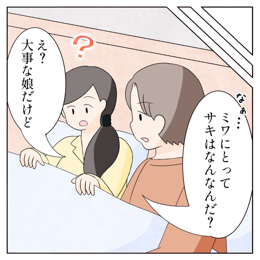 「なぁ、ミワにとってサキはなんなんだ?」夫に言われたお母さんは「え?大事な娘だけど」とキョトンとして言いました。なぜそんな質問をされるのか、全く見当がつかない感じです。