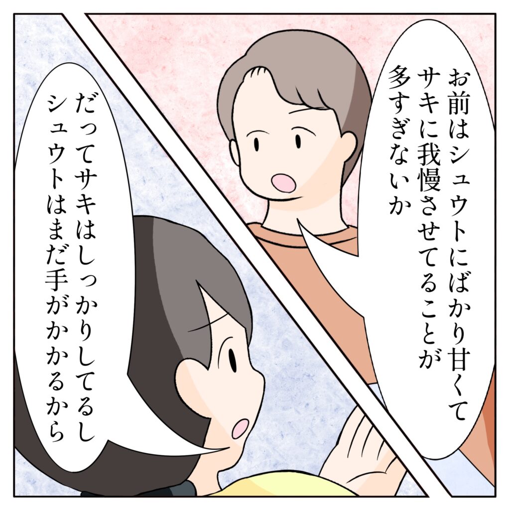 「お前はシュウトばかりに甘くてサキに我慢させてることが多すぎないか。」ズバリ言われたお母さんは「だってサキはしっかりしてるし、シュウトはまだ手がかかるから」と言いました。