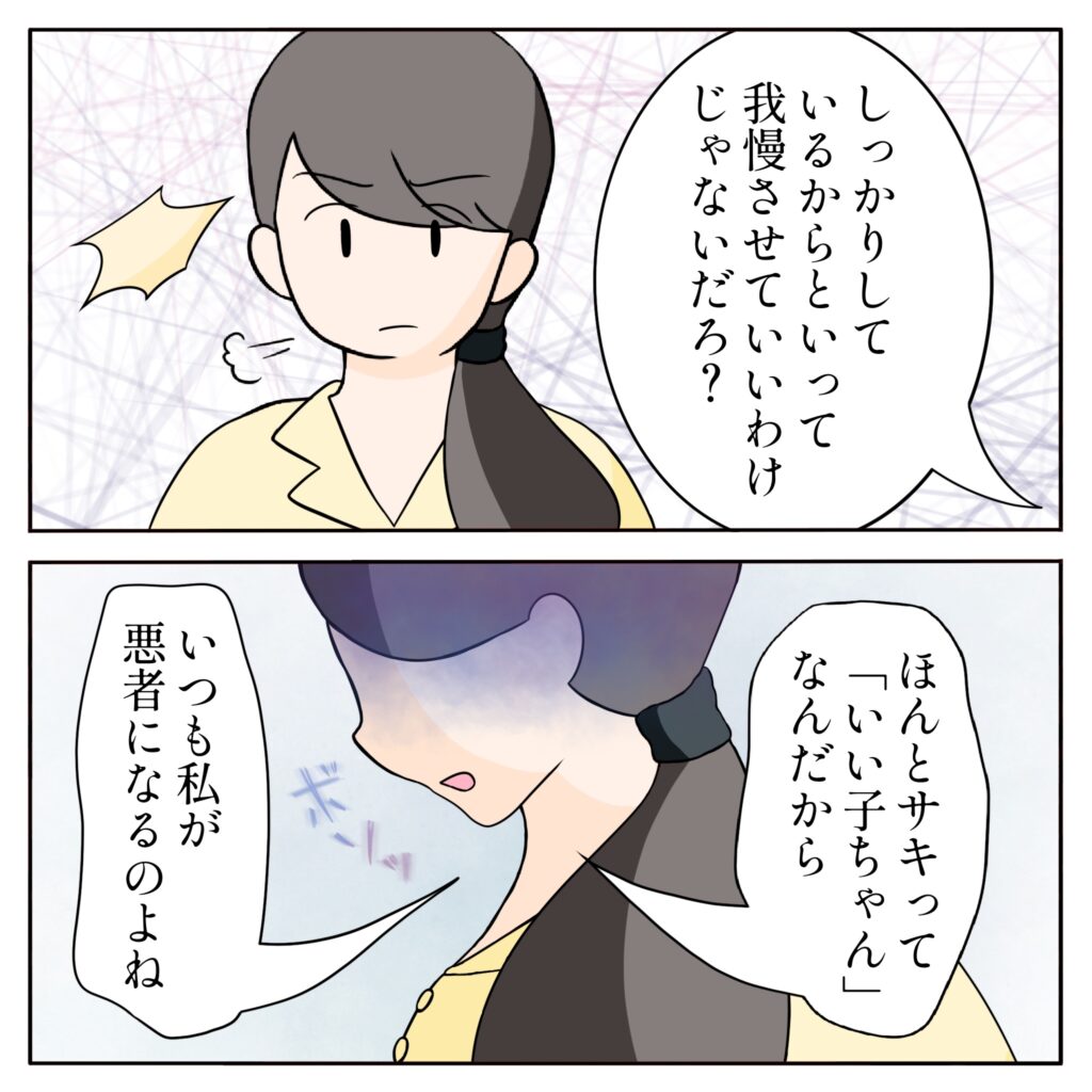 「しっかりしているからといって我慢させていいわけじゃないだろ?」と、言い分をバッサリ否定されたお母さんはカチンときて「ほんとサキって『いい子ちゃん』なんだから。いつも私が悪者になるのよね」と呟きました。