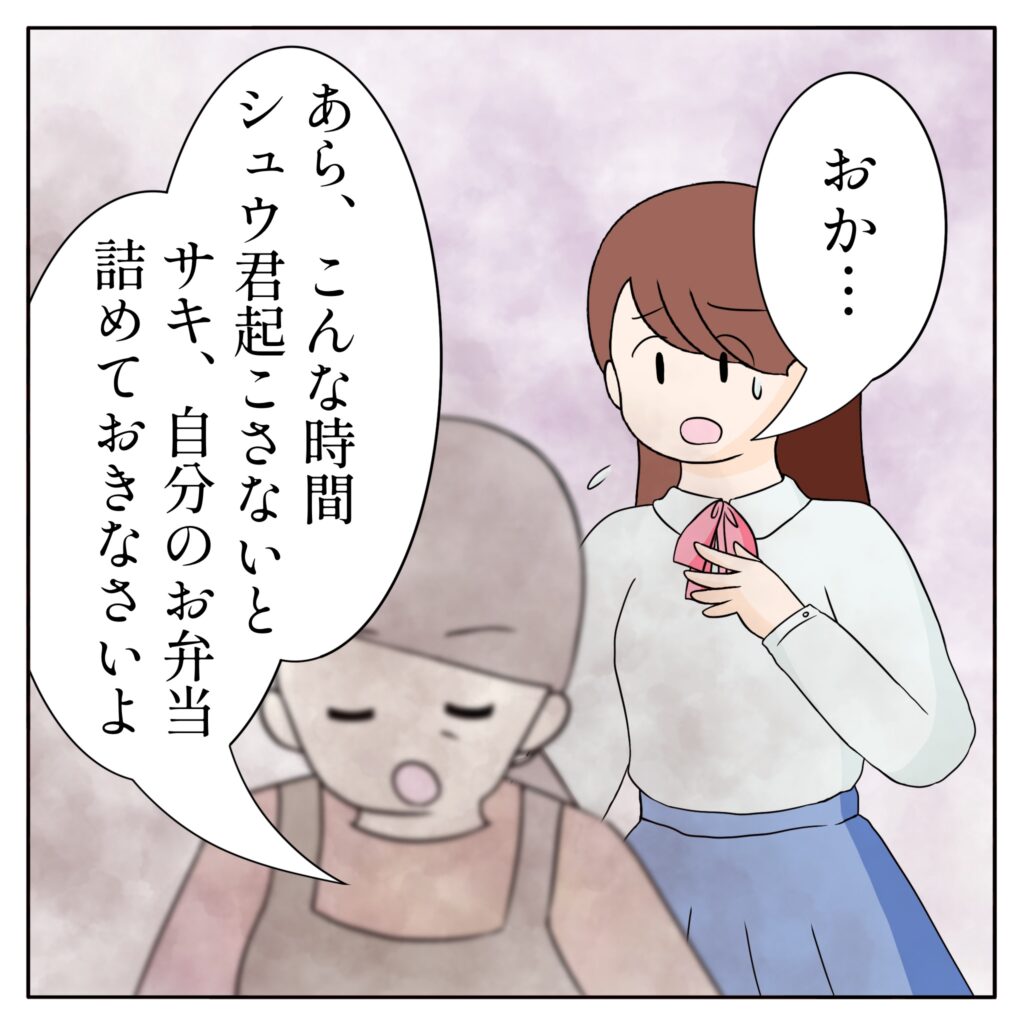 「おか・・・」言いかけても母は「あら、こんな時間。シュウ君起こさないと。サキ、自分のお弁当詰めておきなさいよ。」とそっぽを向いたままでした。
