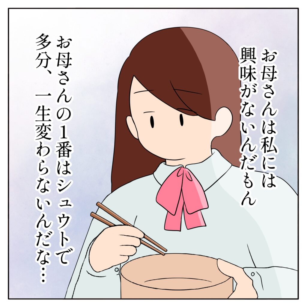ほとんど崩れたおかずを詰めながら、私は確信しました。お母さんは私には興味が無いんだもん。お母さんの一番はシュウトで、多分一生変わらないんだな。