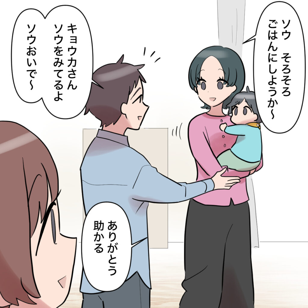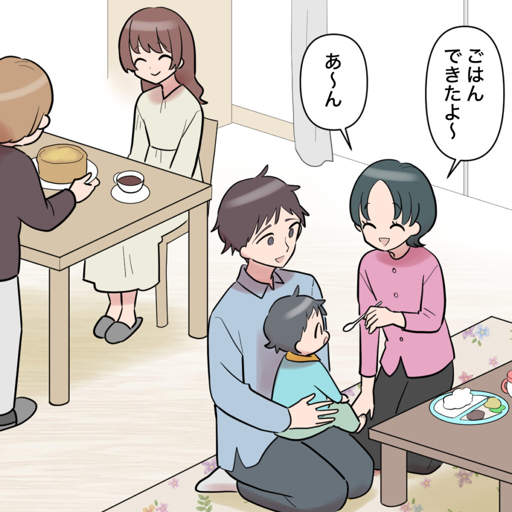 もぐもぐとごはんを食べるソウくんを見て「ソウ、よく食べるようになったね~」トモヤがそう言うと、義母は嬉しそうな顔をして「ナオキもトモヤも、小さい時からよく食べたから懐かしいわ~」と話しました。そのやり取りを見ていたキョウカさんも「みんなに似たのね~」と笑顔で言います。