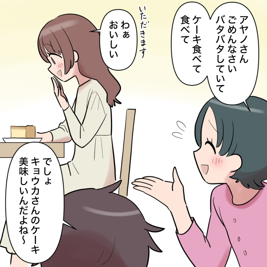 すると「ごめんなさいバタバタしていて、ケーキ食べて食べて」と、キョウカさんが声をかけてくれました。「いただきます・・・わぁおいしい」手作りケーキに感動していると、トモヤがどこか誇らしげに「でしょ、キョウカさんのケーキ美味しいんだよね~」と言いました。