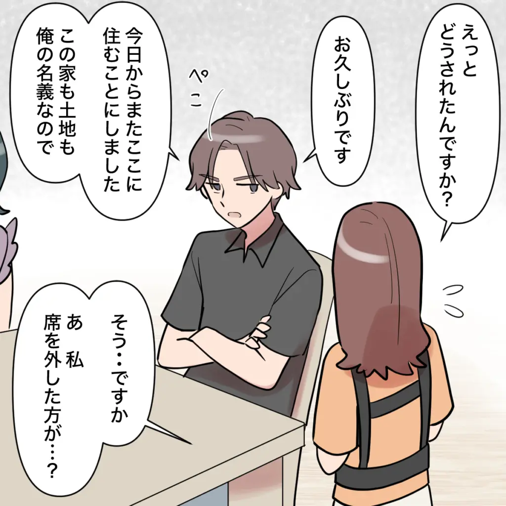 それからさらに1か月後、出先から戻ると、そこには義兄ナオキさんの姿がありました。もう二度とこの家に戻ってくることはないと思い込んでいた私は、「えっ、ナオキさん!?」と大きな声を上げて驚きます。どうやら義母もキョウカさんも何も聞かされていなかったようで、2人とも私と同じように驚いていました。