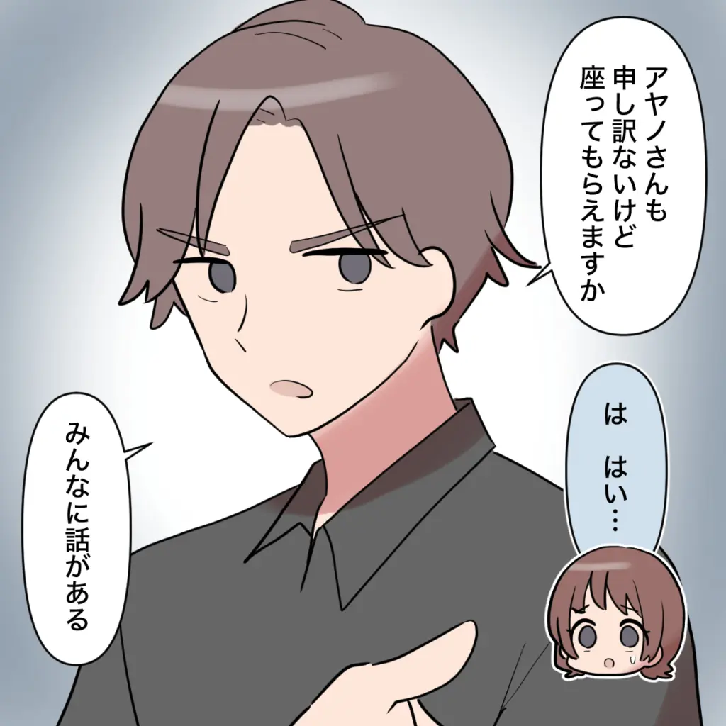 「アヤノさんも、申し訳ないけど座ってもらえますか」ナオキさんにそう促され、私は戸惑いながらも「は、はい・・・」と小さく答えます。私が席に着いたのを確認すると、ナオキさんは改まった様子で「みんなに話がある」と切り出しました。