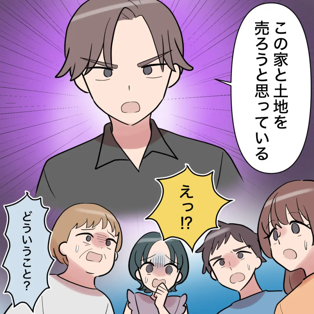 「この家と土地を売ろうと思っている」ナオキさんは私たちをまっすぐ見て、迷いのない口調でそう言い切りました。あまりに突然の宣告に、キョウカさんと義母は「どういうこと!?」と青ざめます。私とトモヤも、予想外の提案に思わず目を見開いてしまいました。