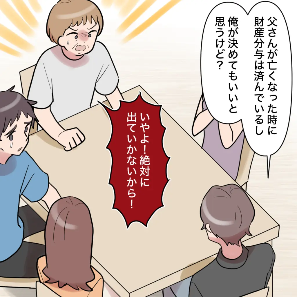 「父さんが亡くなった時に財産分与は済んでいるし、俺が決めてもいいと思うけど?」確かに、この家と土地の所有権はナオキさんにあるので至極真っ当な言い分です。でも、あまりに突然すぎるのでは・・・。義母もひどく驚いているようで、わなわなと震えながら「いやよ!絶対に出て行かないから!」と声を荒げて反対しました。
