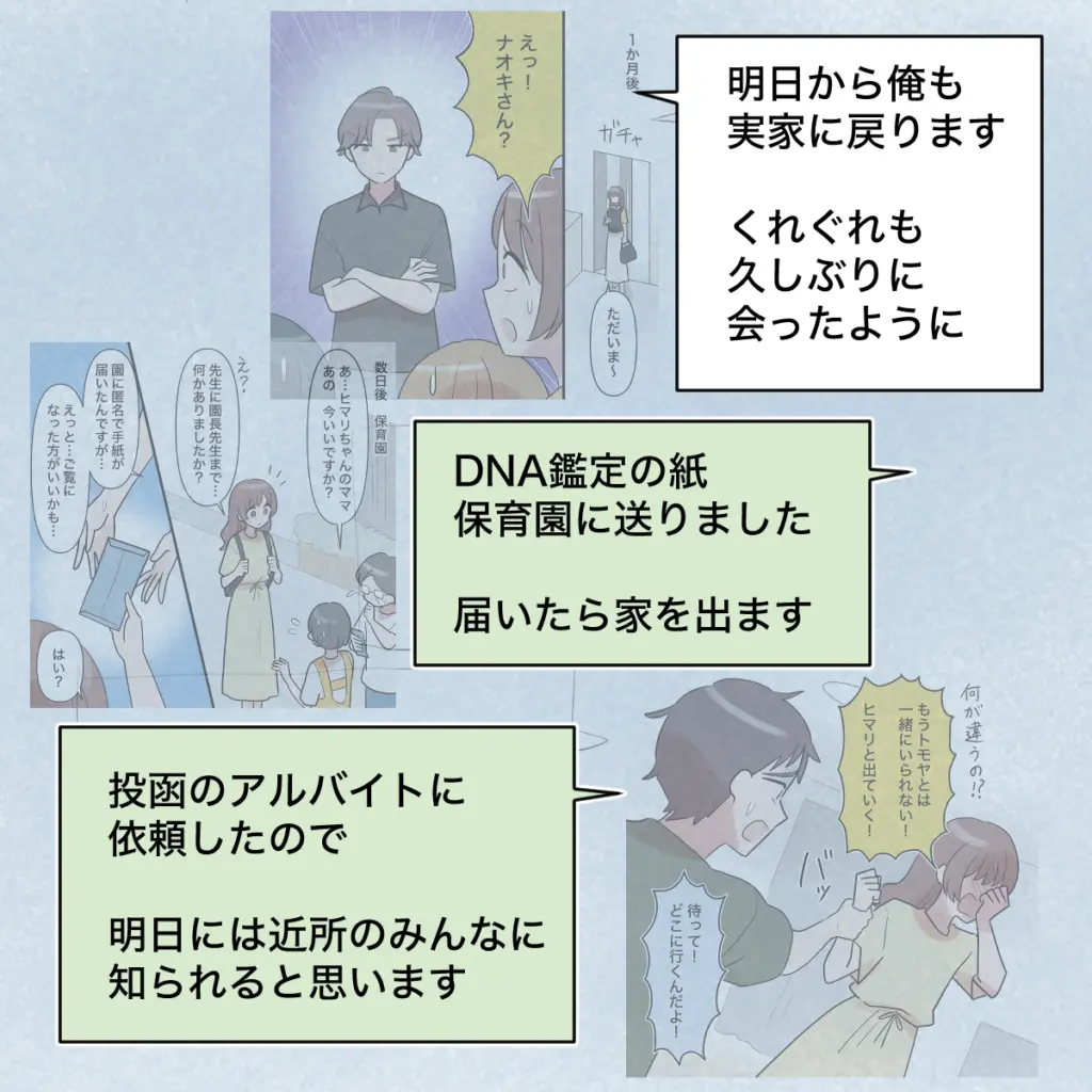 ナオキさんが実家に帰ってくるタイミングも、DNA鑑定の報告書が保育園の先生から渡されることも、全部初めから知っていました。リアクションを取るのが少し大変でしたが、なんとかバレずに済んでよかったです。