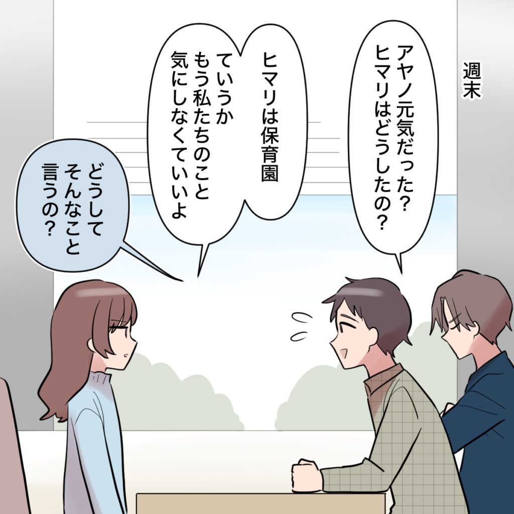 そして週末。ナオキさん同席のもと、ついにトモヤとの話し合いが始まりました。「アヤノ元気だった?ヒマリはどうしたの?」まるで何事もなかったかのように世間話をするトモヤ。その能天気さに苛立ちを覚えながらも、「ヒマリは保育園、ていうかもう私たちのこと気にしなくていいよ」と冷たく言いました。