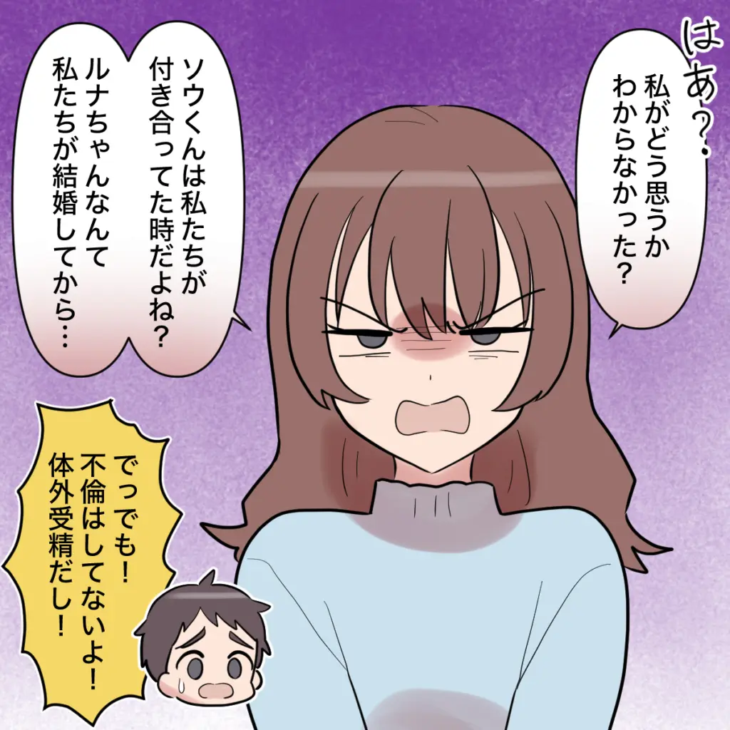 「私がどう思うかわからなかった?ソウくんは私たちが付き合ってた時だよね?ルナちゃんなんて結婚してから・・・」私は嫌悪感をあらわにしてトモヤに言いました。しかし、トモヤはこの期に及んで「でっでも不倫はしてないよ!体外受精だし」と自分がしたことの重大さに気付いていない様子。