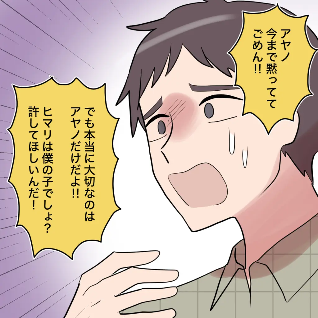 「アヤノ、今まで黙っててごめん!でも本当に大切なのはアヤノだけだよ!ヒマリは僕の子でしょ?許してほしいんだ!」トモヤは必死に謝罪します。ですが私には彼の言葉は何ひとつ響きません。「本当に大切なのはアヤノだけ」その言葉もとうの昔に聞き飽きました。今さら何を言っても手遅れなのです。