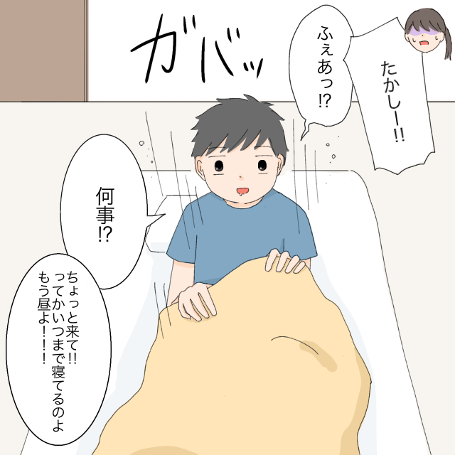 そして、「たかしー!!」と寝ている夫に大声で呼びかけると、「ふぇあっ!?何事!?」と飛び起きた夫に、「ちょっと来て!!ってかいつまで寝てるのよ。もう昼よー!!」と夫を起こしたのでした。