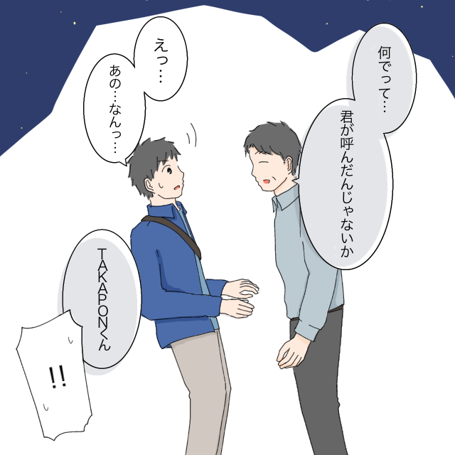 「なんでって・・・君が呼んだんじゃないか」と詰め寄る父。「えっ・・・あの・・・なんっ・・・」とこの状況を理解できない夫に父は「TAKAPONくん」とゲーム名を言うと夫は全てを察しました。