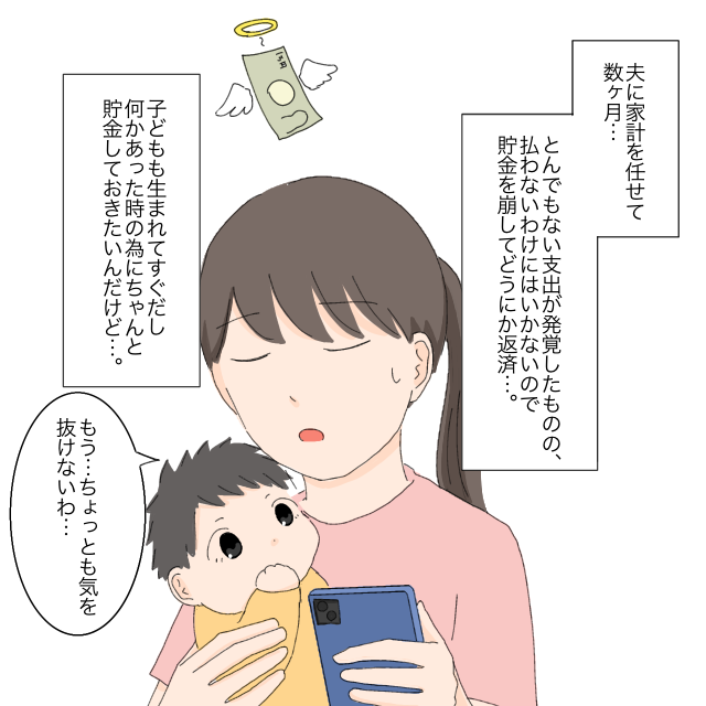 夫に家計を任せて数か月・・とんでもない支出が発覚したものの、払わないわけにはいかず、貯金を崩してどうにか返済しました。子どもも生まれてすぐだし、何かあった時の為にちゃんと貯金しておきたいんだけど・・。そんなことを思いながら、「もう・・ちょっとも気を抜けないわ・・」と思わず呟く私。