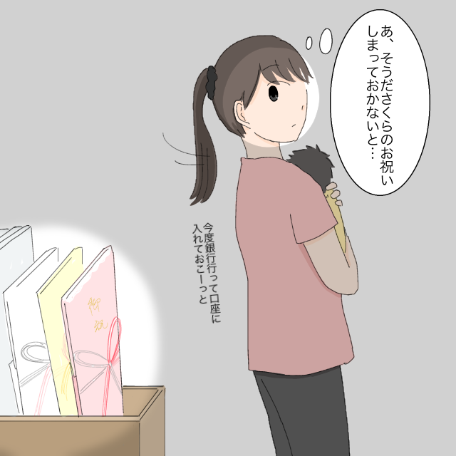 ふと、「あ、そうだ。さくらのお祝いしまっておかないと・・。今度銀行行って口座に入れておこーっと」そう思い、祝儀袋の置いてある場所へ。