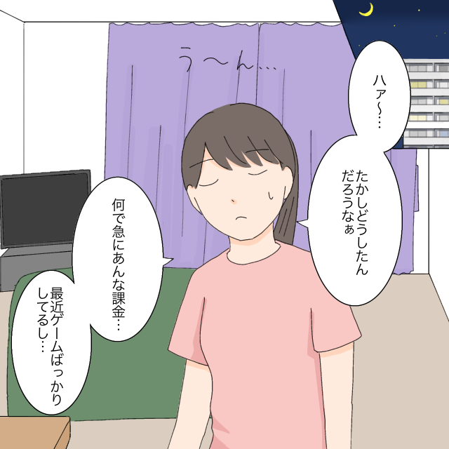 夫がゲーム課金をしていたことが発覚し心配になる私。「ハァ~・・・たかしどうしたんだろうなぁ。何で急にあんな課金・・・最近ゲームばっかりしてるし・・・」