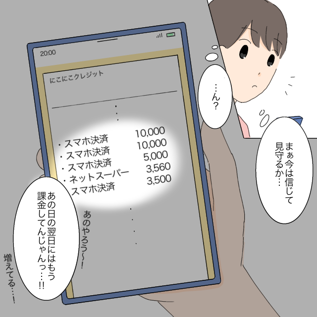 土下座して謝っていた夫を見て「まぁ今は信じて見守るか」と思っていたのにカードの使用履歴をみると謝った翌日にはまた課金していることが発覚。「あのやろう~!」と再びイライラが・・・