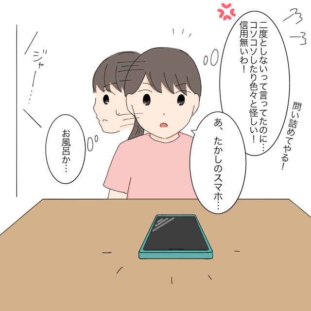 「二度としないって言ってたのに・・・コソコソしたり色々と怪しい!信用無いわ!」とたかしがお風呂から出たら問い詰めようとしているとテーブルにポツンとたかしのスマホが。