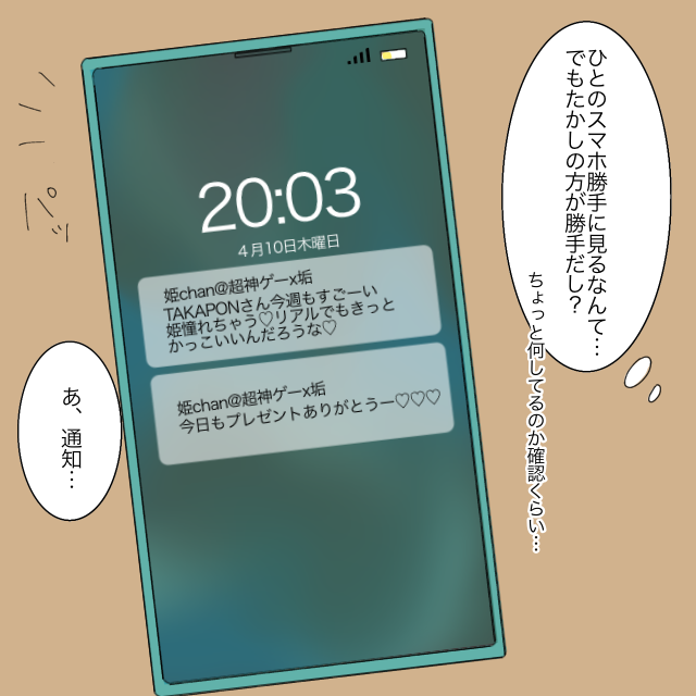 「人のスマホ勝手に見るなんて・・・」と躊躇したものの「でもたかしの方が勝手だし?ちょっと何してるのか確認くらい・・・」と思い触ろうとすると丁度ゲームの通知が届きました。そこには『TAKAPONさん今週もすごーい!姫憧れちゃう!リアルでもきっとかっこいいんだろうな!今日もプレゼントありがとうー!!!』と『姫chan』という女の子らしい人物からメッセージが届いていました。