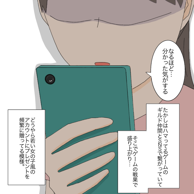 「なるほど・・・分かった気がする。」たかしはハマってるゲームのギルド仲間とSNSで繋がっていてそこでゲームの戦果で盛り上がり・・・どうやら若い女の子風のアカウントにプレゼントを頻繁に贈っているようでした。