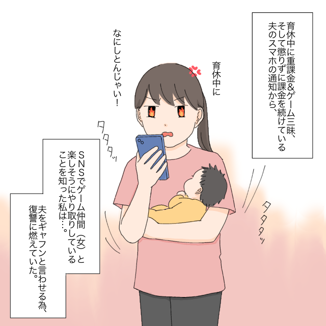 育児中に重課金&ゲーム三昧、そして懲りずに課金を続けている夫のスマホの通知からSNSで女性のゲーム仲間とやり取りしていることを知った私は・・・夫をギャフンと言わせる為、復讐に燃えていました。