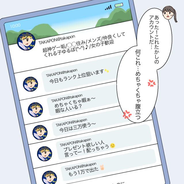 私はアカウント名から夫のSNSを特定。「あった!これたかしのアカウントだ・・・何これ・・・めちゃくちゃ腹立つ。」そこには、『めちゃくちゃ暇ぁ~暇な人いる?』や『今日は3万使う~』や『プレゼント欲しい人言ってー!配っちゃう』などの呟きが。
