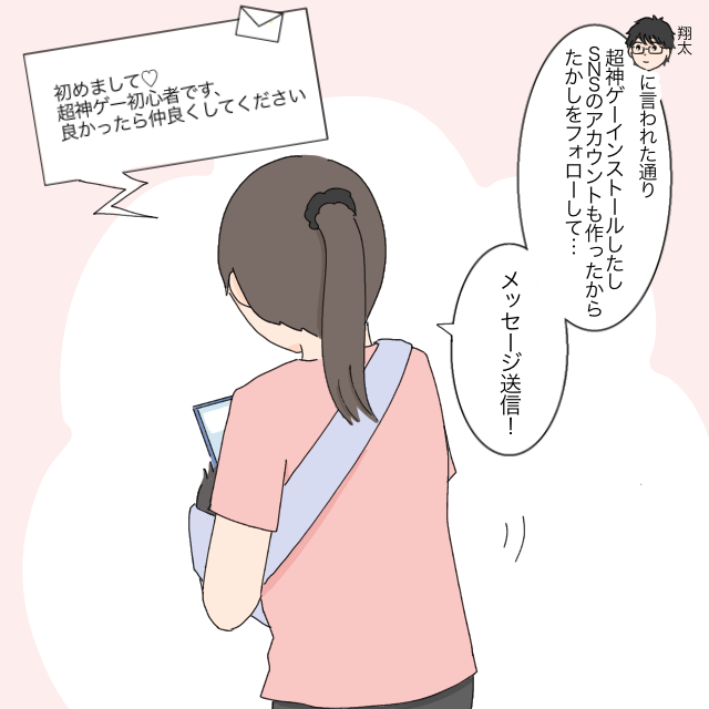 弟の翔太に言われた通り、超神ゲーをインストールしてSNSのアカウントを作ったあと、たかしをフォローしました。そして『初めまして!超神ゲー初心者です、良かったら仲良くしてください』とメッセージを送信しました。