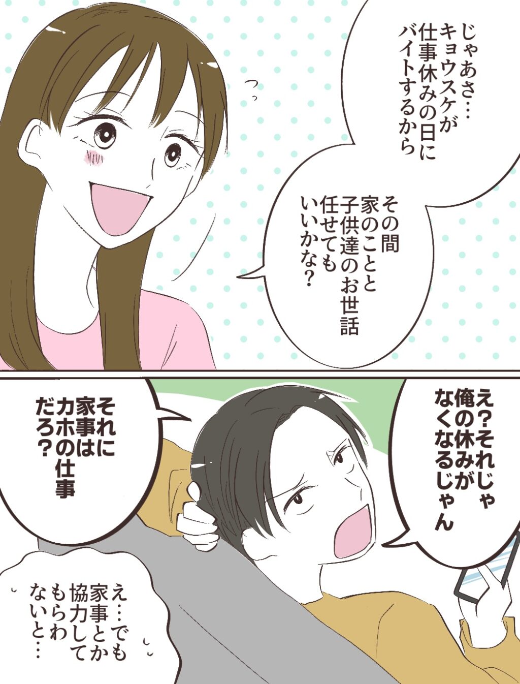 「じゃあさ・・キョウスケが仕事休みの日にバイトするから、その間家のことと子ども達のお世話任せてもいいかな?私の言葉に、「え?それじゃ俺の休みがなくなるじゃん。それに家事はカホの仕事だろ?」そう言われて、「え・・でも、家事とか協力してもらわないと・・」と訴えると、
