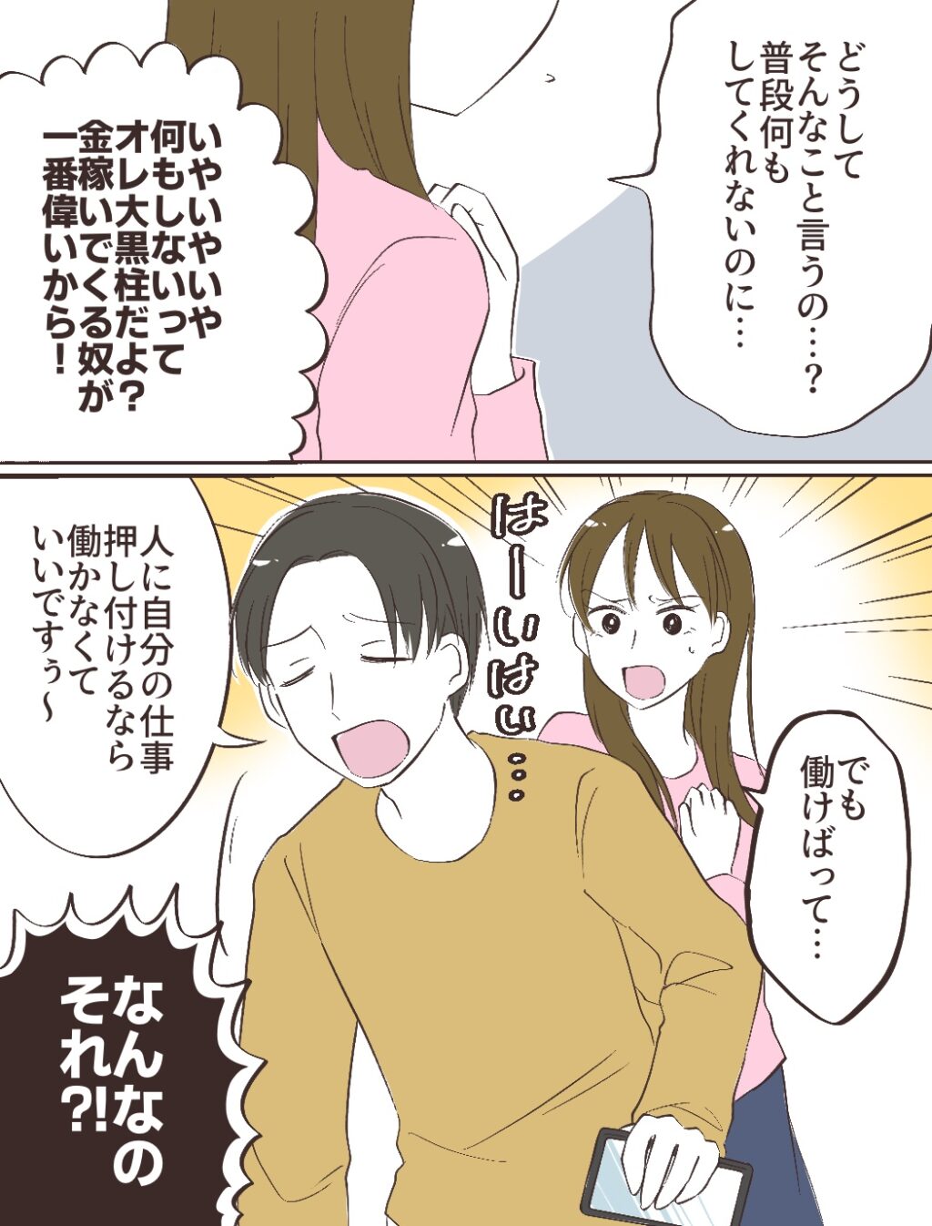 「どうしてそんなこと言うの・・?普段何もしてくれないのに・・」そう訴えると、「いやいやいや、何もしないってオレ大黒柱だよ?金稼いでくる奴が一番偉いから!」そう言い切るキョウスケに、「でも働けばって・・」と反論しようとするも、「はーいはい‥人に自分の仕事押し付けてるなら働かなくていいですぅ~」と言い出すキョウスケに「なんなのそれ!?」と怒る私。