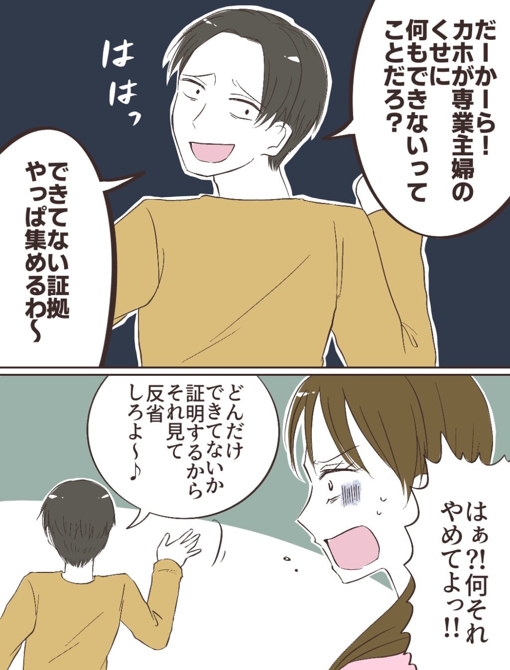 すると、「だーかーらー!カホが専業主婦のくせに何もできないってことだろ?できてない証拠やっぱ集めるわ~」そう言ってバカにしたように笑うキョウスケに、「はぁ!?何それやめてよっ!!」と言うも、「どんだけてきてないか証明するからそれ見て反省しろよ~」そう言うと、とっとと去ってしまいました。