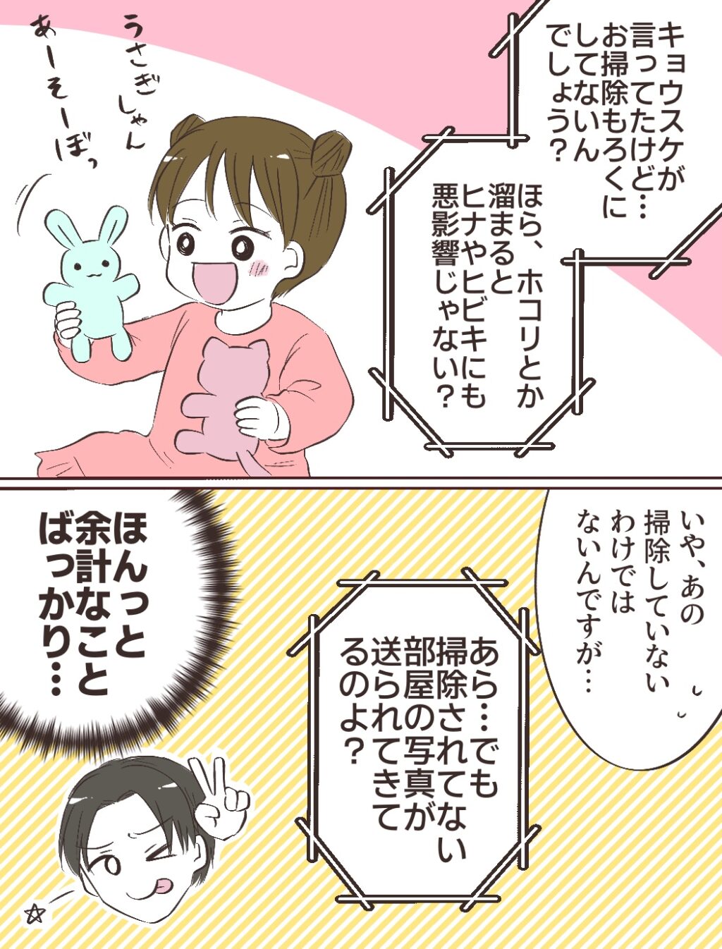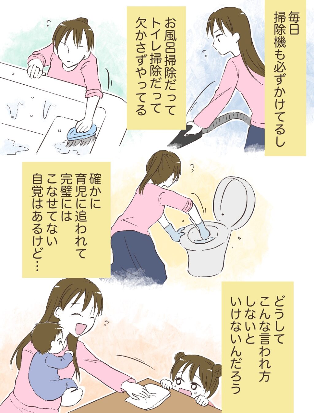 毎日掃除機も必ずかけてるし、お風呂掃除だって、トイレ掃除だって欠かさずやってる。確かに育児に追われて完璧にはこなせてない自覚はあるけど・・どうしてこんな言われ方しないといけないんだろう。と考え込む私。