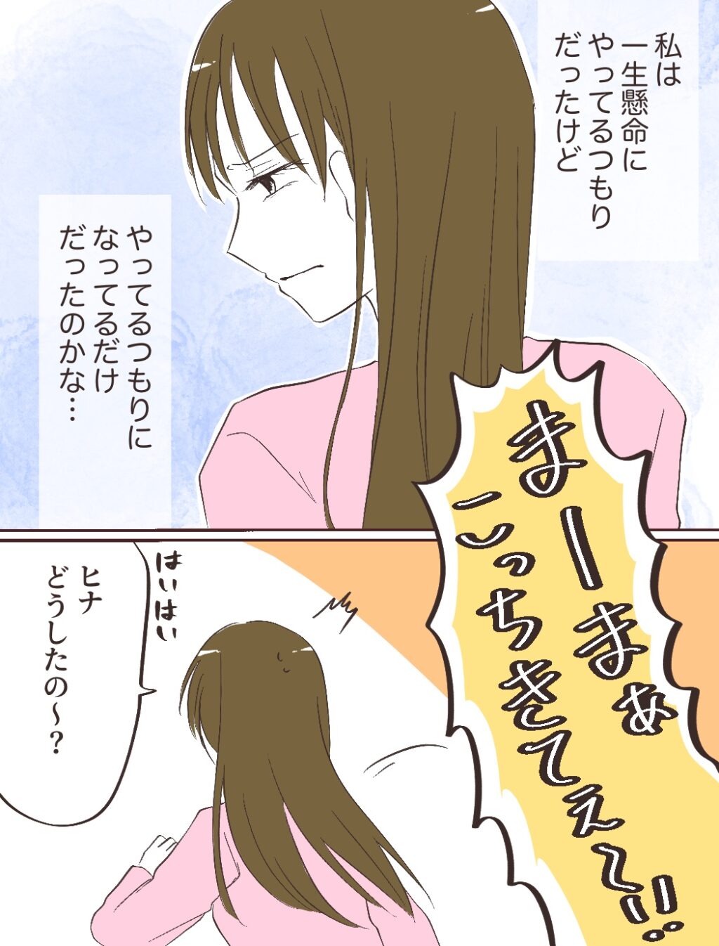 私は一生懸命にやってるつもりだけど、やってるつもりになってるだけだったのかな・・。そう思っていると、「まーまぁ、こっちきてぇ~!!」ヒナに呼ばれて「ヒナどうしたの~?」そう言ってヒナの元へと行きました。
