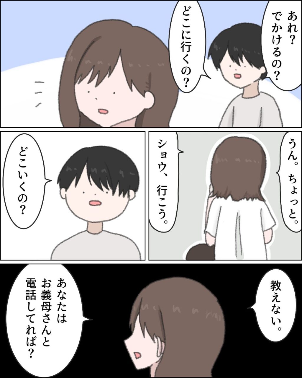 出かける準備をしていると「あれ?でかけるの?どこに行くの?」とユウタに聞かれましたが、「うん。ちょっと」とはっきりは答えず「ショウ、行こう」とショウを促しました。すると「どこ行くの?」とユウタがもう一度聞いてきましたが、ショウよりも義母の電話を優先するユウタにうんざりの私は「教えない。あなたはお義母さんと電話してれば?」とだけ伝えてショウと家を出ました。