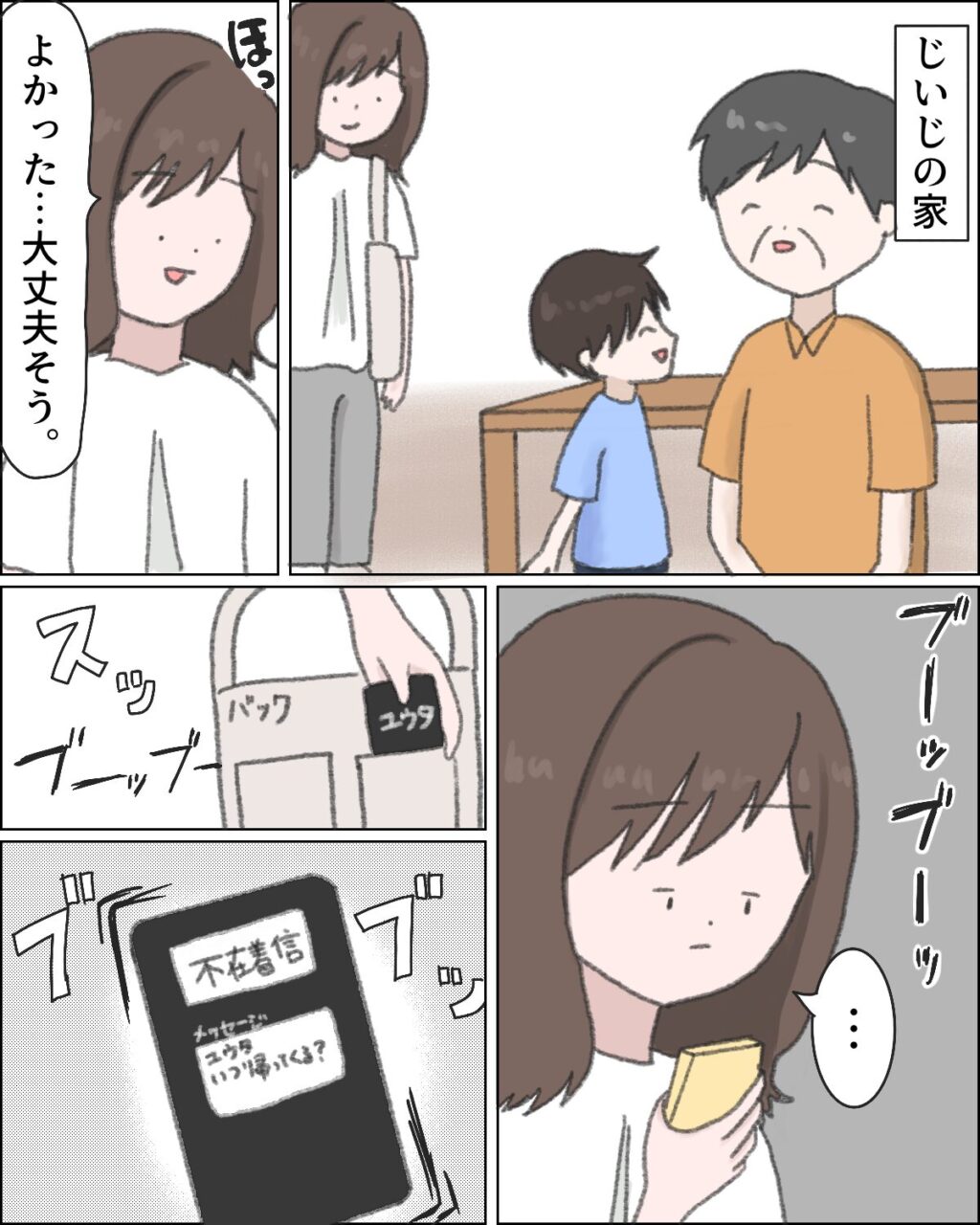 じいじの家に行くと、ショウはいつも通り元気な様子で「よかった・・大丈夫そう」とホッとしました。しばらくするとユウタから電話がかかってきましたが、私は電話にでることなくスマホをカバンにしまいました。その後も「いつ帰ってくる?」とメッセージが届きましたが、返信しませんでした。