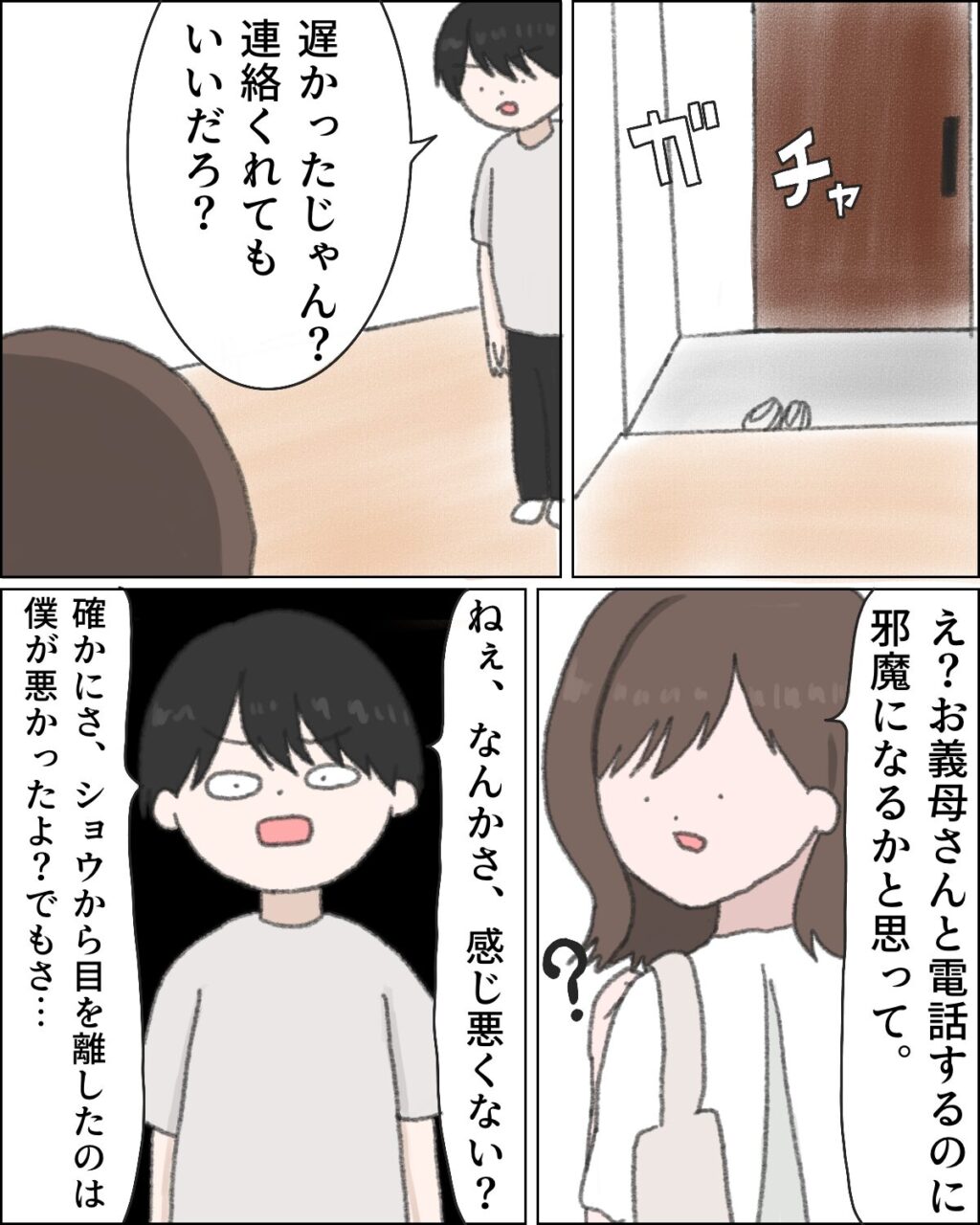 帰宅すると、「遅かったじゃん?連絡くれてもいいだろ?」とユウタが不満そうに言ってきましたが、「え?お義母さんと電話するのに邪魔になるかと思って」と平然と返すと「ねぇ、なんかさ、感じ悪くない?確かにさ、ショウから目を離したのは僕が悪かったよ?でもさ・・」と、反省しているのかしていないのか・・ユウタは私の態度に文句を言ってきました。