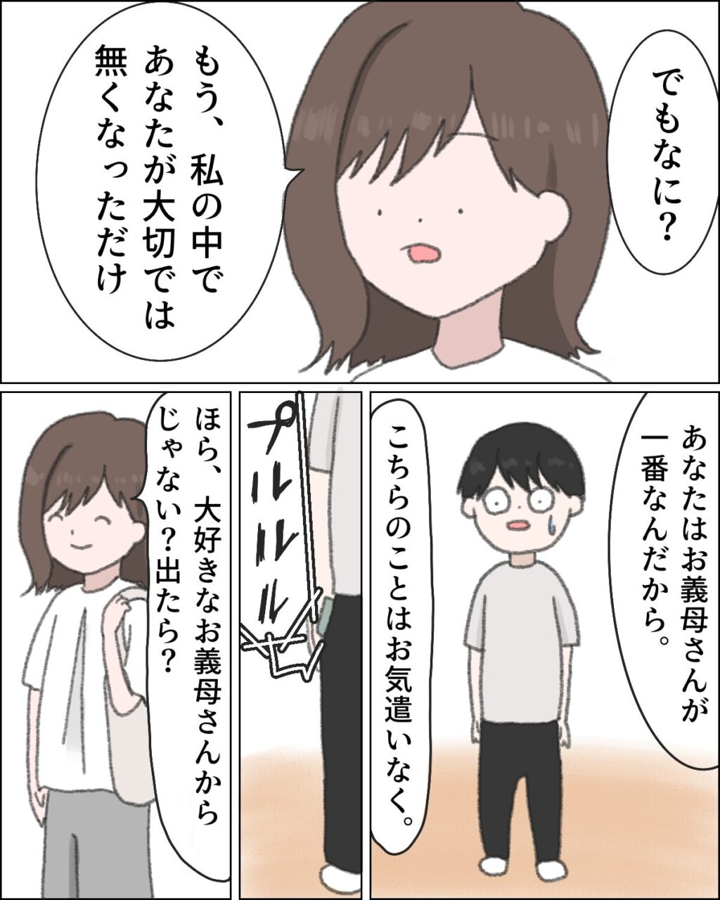 ショウくんがジャングルジムから落ちた翌日、まだ心配だったカナコさんは念のため大きい病院が近くにある実家に遊びに行くことにしました。出かける準備をしているカナコさんに気付いたユウタさんは行き先を尋ねますが、ショウくんよりも義母の電話を優先するユウタさんに期待するのをやめたカナコさんは「教えない。あなたはお義母さんと電話してれば?」と冷たく言って、行き先を告げずにショウくんと家を出ました。実家にいる間も、カナコさんはユウタさんからの連絡を無視。帰宅すると、連絡を無視されたユウタさんは「遅かったじゃん。連絡くれてもいいだろ?」と不満を口にしますが、カナコさんは「お義母さんと電話するのに邪魔になるかと思って」とさらり。ユウタさんが「感じ悪くない?確かにショウから目を離したのは僕が悪かったよ?でもさ・・」とカナコさんの態度にムッとすると、カナコさんは「でもなに?もう、私の中であなたが大切では無くなっただけ」ときっぱり言い放ちました。「あなたはお義母さんが一番なんだから。こちらのことはお気遣いなく」とカナコさんから他人行儀に言われたユウタさんは呆然・・。ちょうどその時、ユウタさんの電話が鳴ると、カナコさんは「ほら、大好きなお義母さんからじゃない?出たら?」とにっこりして言いました。