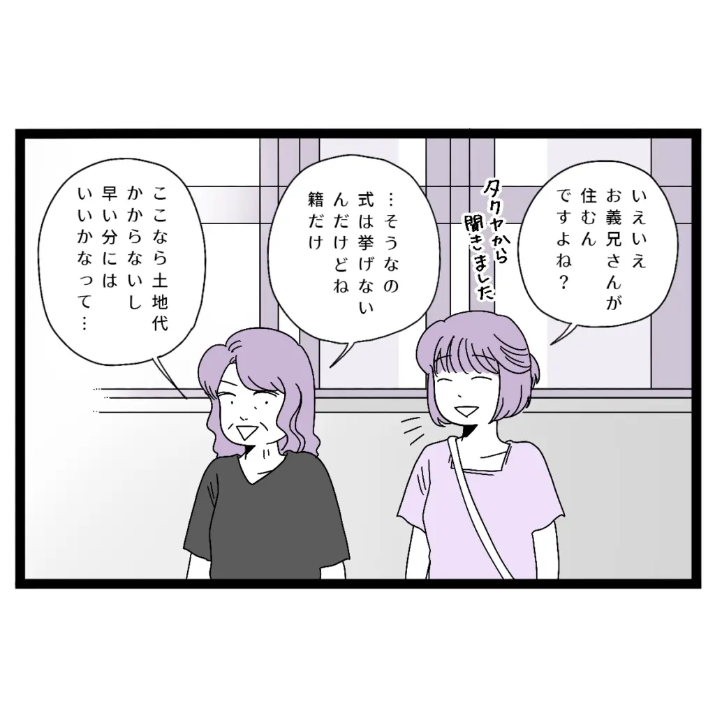 「いえいえ、お義兄さんが住むんですよね?」そう問いかけると、義母は嬉しそうに「そうなの、式は挙げないんだけどね、ここなら土地代かからないし早い分にはいいかなって」と話します。夫のタクヤには兄がいて、最近結婚したみたい。義実家の隣にちょうど空き地があったので、そこに新居を建てることになったそうです。
