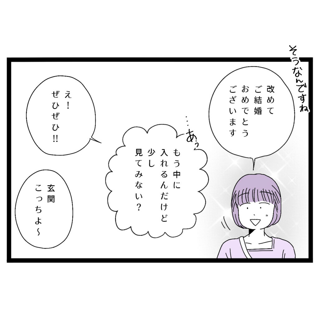 身近な人の結婚報告っていつ聞いても幸せな気持ちになる。そんなことを思っていると、「もう中に入れるんだけど少し見てみない?」と義母が誘ってくれました。完成前の家を見学できるなんて楽しそう!私が「え!ぜひぜひ」と答えると、義母は嬉しそうに「玄関、こっちよ~」と案内してくれました。