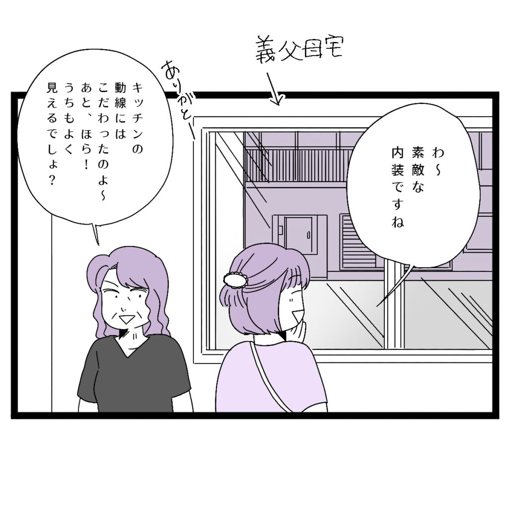 家に入ると、広くてお洒落な内装が広がっていました。「わ~素敵な内装ですね」私の言葉が嬉しかったのか、義母は「キッチンの動線にはこだわったのよ~」と誇らしげに話します。そして窓のほうを指さしながら、「あと、ほら!うちもよく見えるでしょ?」と得意げに言いました。
