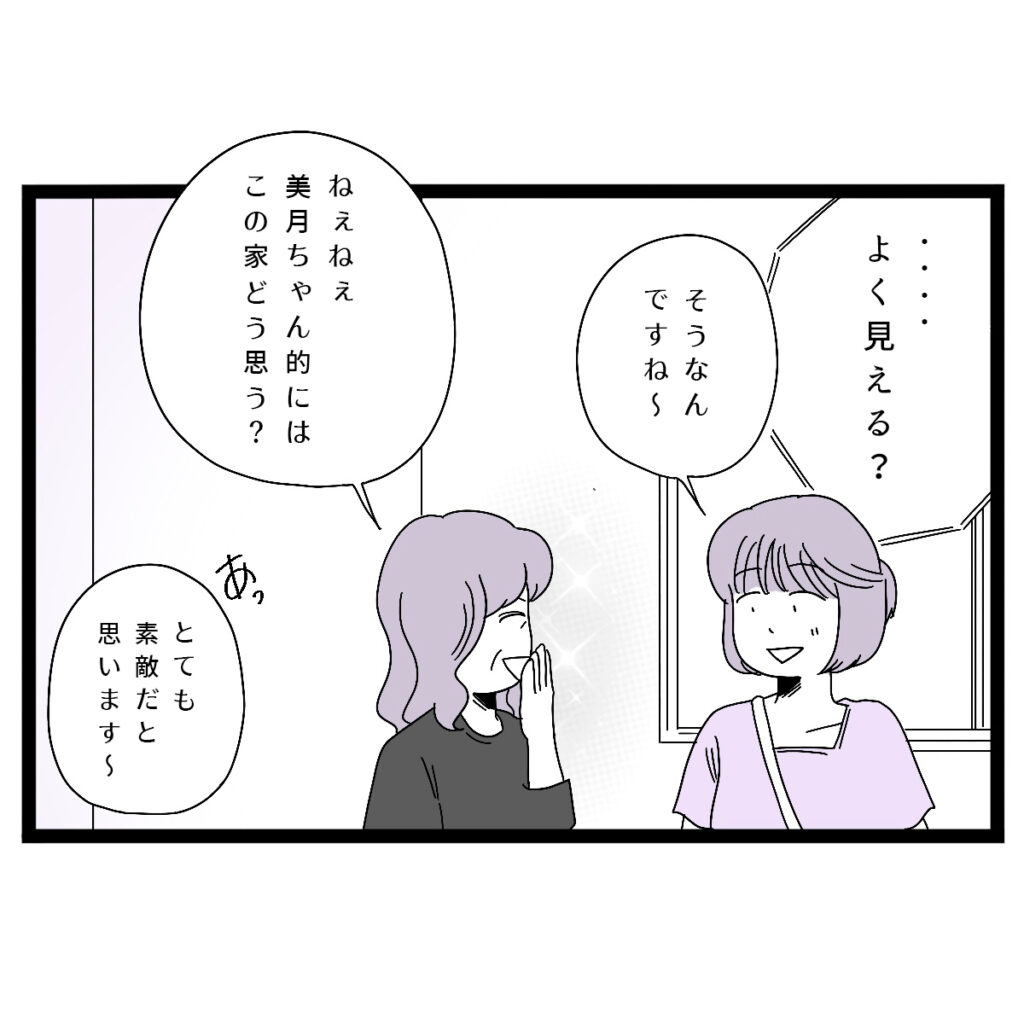 ・・・よく見える?義母の言葉に違和感を覚えつつも、私は「そうなんですね~」と笑顔で返しました。すると、義母が急に「ねぇねぇ美月ちゃん的にはこの家どう思う?」と感想を求めてきました。私は素直に「とても素敵だと思います~」と答えます。