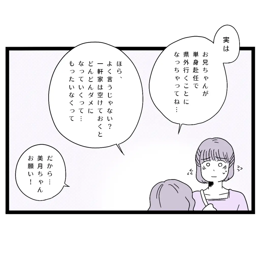 理由を聞くと、この家に住むはずだった義兄が、単身赴任で県外に行くことになってしまったそう。「ほら、よく言うじゃない?一軒家は空けておくとどんどんダメになっていくって・・・」せっかく建てた家なのに誰も住まないのはもったいない、そう思っての提案でした。