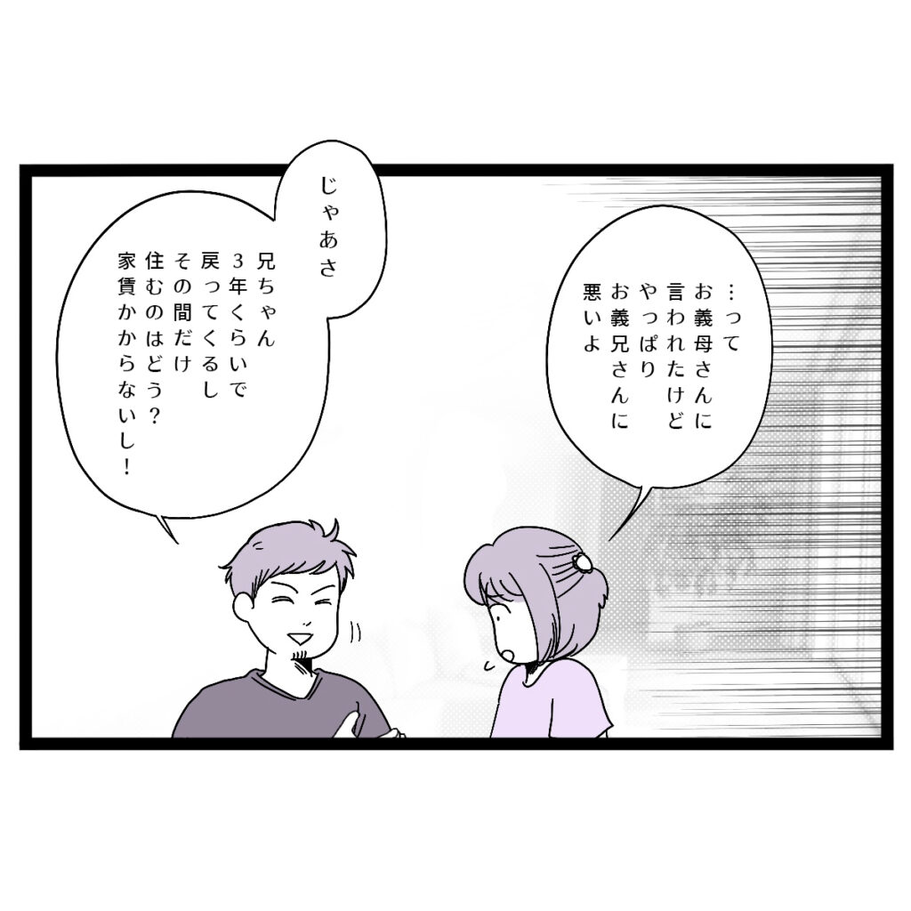 その日の夜。私は義母からの提案を夫に相談しました。「・・・ってお義母さんに言われたけど、やっぱりお義兄さんに悪いよ」義兄が建てた家なのに、私たちが先に住むなんて。すると、夫は悩む私に「兄ちゃん3年くらいで戻ってくるし、その間だけ住むのはどう?家賃かからないし!」と提案しました。