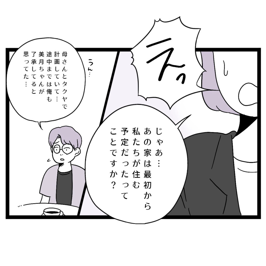 カズヤさんからタクヤさんと義母が企てた計画を聞いた美月さん。カズヤさんが住む予定だった家ではなく、最初から美月さんたちが住む計画だったと知り絶句。この時まで結局言えなかったことを謝るカズヤさんに、「美月ちゃんはどうしたい?」と聞かれ、「タクヤと別れたくないけど、あの家にはいたくない」と本音を伝えた美月さんに、不動産会社に一緒に行くと言ったカズヤさん。そんな2人で出かける姿を窓から見ていた義母、新しく何か企みそうですよね。